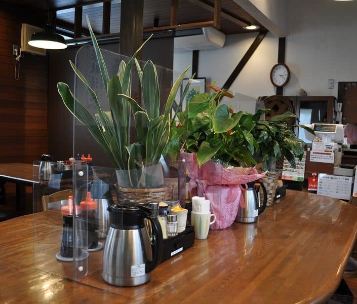 店内中央のテーブルは、主にお一人様のお客様にご利用いただいておりますが、相席になった場合、席の向かいのお客様が、万一、咳をされたり、むせったりしても飛沫がかからないように、中央にアクリル板を設置いたしました。