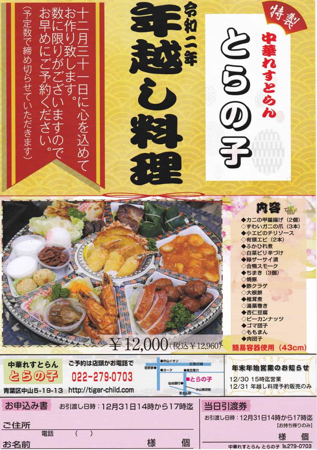 中華レストラン とらの子では、「令和二年 年越し料理」の予約受付を開始いたしましたので、お知らせ申し上げます。