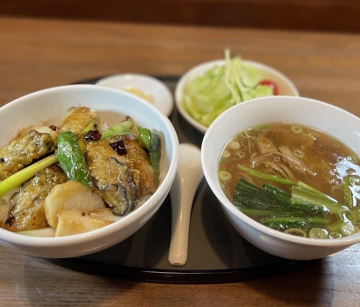 「牡蠣丼セット(サラダ・ミニラーメン付き)」は、販売期間が冬季限定にも関わらず、年間を通してのご飯ものの中で、最もご注文数が多く、「中華レストラン とらの子」の看板メニュー「酸辣湯麺(スワンラータンメン)」に次ぐ人気商品となります。